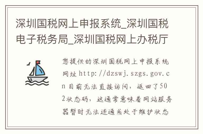 您提供的深圳国税网上申报系统网址 http://dzswj.szgs.gov.cn 目前无法直接访问,返回了502状态码,这通常意味着网站服务器暂时无法连通或处于维护状态。因此,无法基于该网址内容进行说明。不过,深圳市的网上办税服务已统一整合至“国家税务总局深圳市税务局电子税务局”,其官方入口网站为 https://etax.shenzhen.chinatax.gov.cn -2-3。以下是关于该平台内容、服务及联系方式的详细信息。