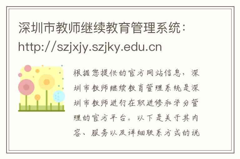 根据您提供的官方网站信息,深圳市教师继续教育管理系统是深圳市教师进行在职进修和学分管理的官方平台。以下是关于其内容、服务以及详细联系方式的说明。