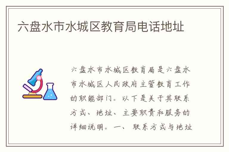 六盘水市水城区教育局是六盘水市水城区人民政府主管教育工作的职能部门。以下是关于其联系方式、地址、主要职责和服务的详细说明。