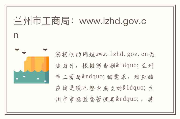 您提供的网址www.lzhd.gov.cn无法打开,根据您查找“兰州市工商局”的需求,对应的应该是现已整合成立的“兰州市市场监督管理局”。其官方网站为:http://scjgj.lanzhou.gov.cn/ 。以下是关于该机构官网的内容、服务、地址及联系方式的详细信息。