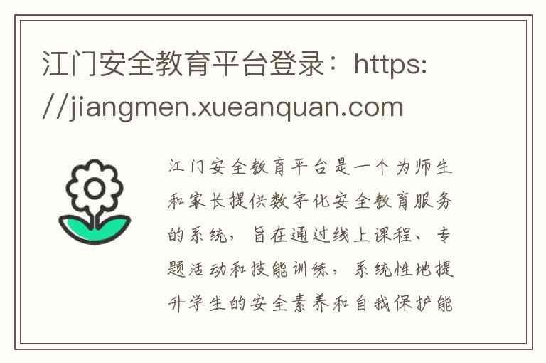 江门安全教育平台是一个为师生和家长提供数字化安全教育服务的系统,旨在通过线上课程、专题活动和技能训练,系统性地提升学生的安全素养和自我保护能力。以下是关于其登录方式、核心服务及联系渠道的详细说明。