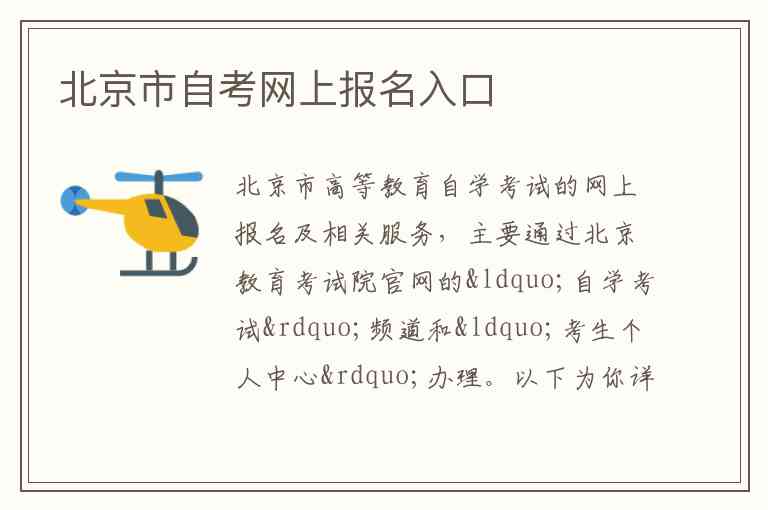 北京市高等教育自学考试的网上报名及相关服务,主要通过北京教育考试院官网的“自学考试”频道和“考生个人中心”办理。以下为你详细介绍其入口、核心服务内容及官方联系方式。
