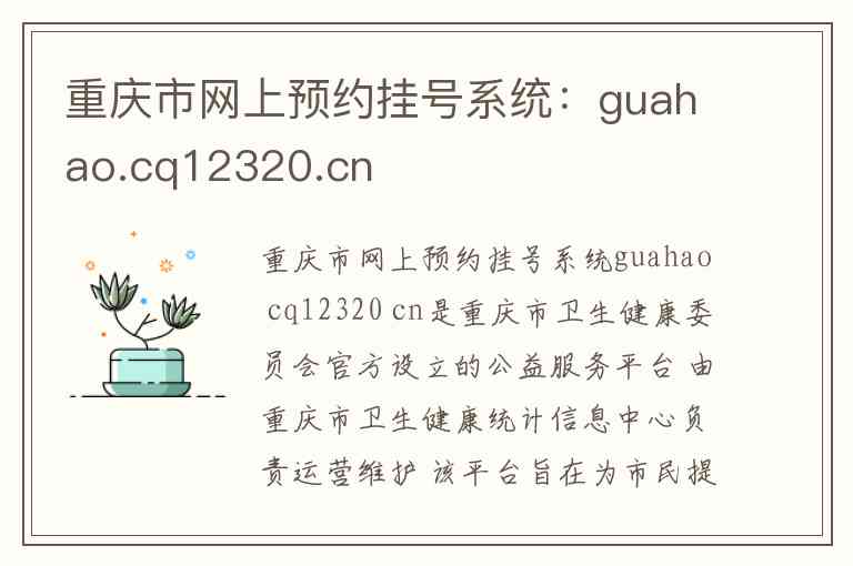 重庆市网上预约挂号系统guahao cq12320 cn是重庆市卫生健康委员会官方设立的公益服务平台 由重庆市卫生健康统计信息中心负责运营维护 该平台旨在为市民提供便捷的医疗健康服务 其核心目标是整合全市医疗资源 简化就医流程