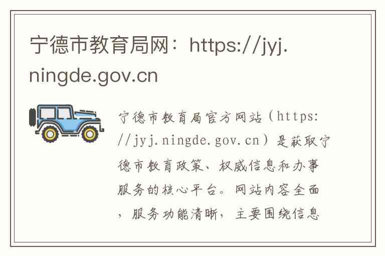 宁德市教育局官方网站(https://jyj.ningde.gov.cn)是获取宁德市教育政策、权威信息和办事服务的核心平台。网站内容全面,服务功能清晰,主要围绕信息公开、新闻动态、政务服务、互动交流和专题专栏展开。