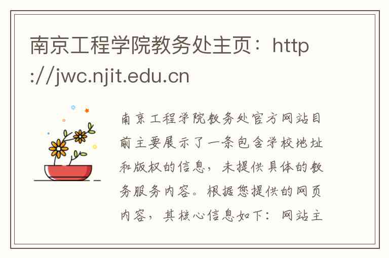 南京工程学院教务处官方网站目前主要展示了一条包含学校地址和版权的信息,未提供具体的教务服务内容。根据您提供的网页内容,其核心信息如下: