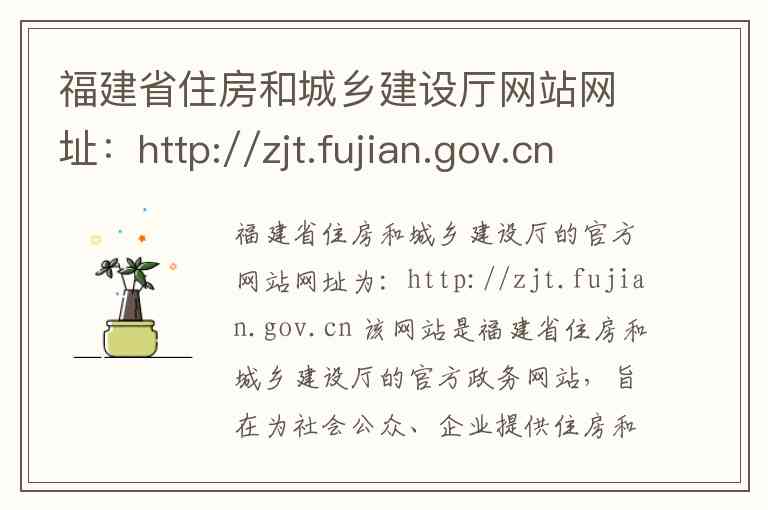 福建省住房和城乡建设厅的官方网站网址为:http://zjt.fujian.gov.cn 该网站是福建省住房和城乡建设厅的官方政务网站,旨在为社会公众、企业提供住房和城乡建设领域的政务信息公开、网上办事和互动交流服务。
