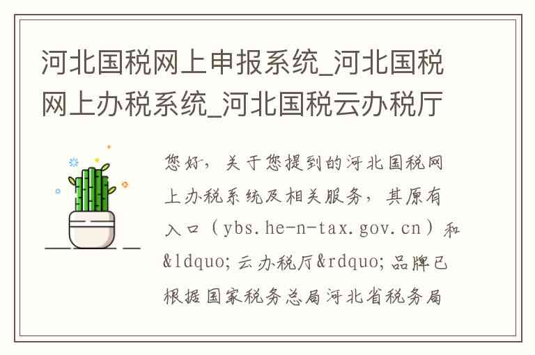您好,关于您提到的河北国税网上办税系统及相关服务,其原有入口(ybs.he-n-tax.gov.cn)和“云办税厅”品牌已根据国家税务总局河北省税务局的统一部署,整合升级为“河北省网上税务局”(现多称“河北省电子税务局”)。以下为您梳理了该平台的当前内容、服务、官方地址及联系方式。