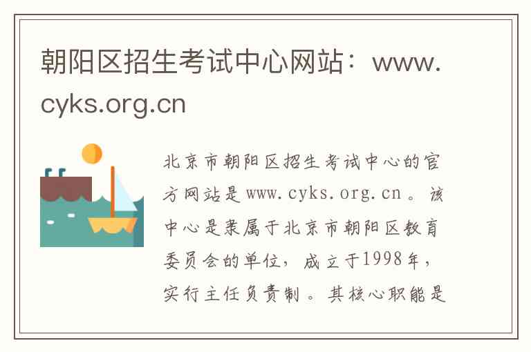北京市朝阳区招生考试中心的官方网站是 www.cyks.org.cn 。该中心是隶属于北京市朝阳区教育委员会的单位,成立于1998年,实行主任负责制 。其核心职能是负责朝阳区内各级各类教育招生考试的组织、管理与服务工作 。