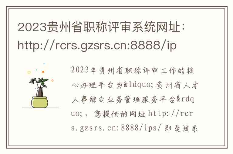 2023年贵州省职称评审工作的核心办理平台为“贵州省人才人事综合业务管理服务平台”,您提供的网址 http://rcrs.gzsrs.cn:8888/ips/ 即是该系统的登录与操作入口。该平台旨在为全省专业技术人员提供职称申报、评审、管理及查询等全流程的“一站式”网上服务,实现了从线下办理到“云上评”的转变。