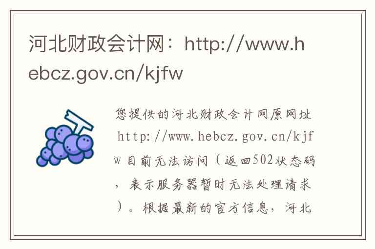 您提供的河北财政会计网原网址 http://www.hebcz.gov.cn/kjfw 目前无法访问(返回502状态码,表示服务器暂时无法处理请求)。根据最新的官方信息,河北省财政厅的门户网站网址已经变更为 http://czt.hebei.gov.cn ,其会计管理服务的主要平台现为“河北省会计人员管理服务平台”,您可以通过新入口 https://czt.hebei.gov.cn/kjfw/ 访问 。