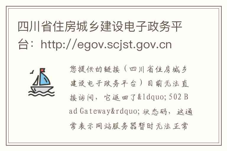 您提供的链接(四川省住房城乡建设电子政务平台)目前无法直接访问,它返回了“502 Bad Gateway”状态码,这通常表示网站服务器暂时无法正常工作,可能是由于维护、过载或技术故障导致。因此,我无法基于该链接页面为您进行介绍。