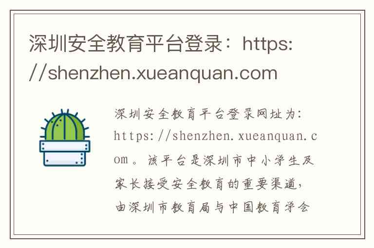 深圳安全教育平台登录网址为:https://shenzhen.xueanquan.com 。该平台是深圳市中小学生及家长接受安全教育的重要渠道,由深圳市教育局与中国教育学会主办 。以下为您详细说明其内容与服务,以及相关的联系方式和地址信息。