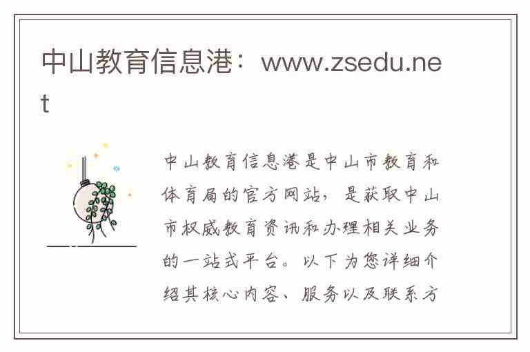 中山教育信息港是中山市教育和体育局的官方网站,是获取中山市权威教育资讯和办理相关业务的一站式平台。以下为您详细介绍其核心内容、服务以及联系方式。
