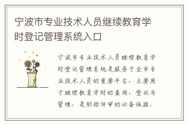 宁波市专业技术人员继续教育学时登记管理系统是服务于全市专业技术人员的重要平台,主要用于继续教育学时的查询、登记与管理,是职称评审的必备依据。以下为您详细介绍该系统的主要入口、服务内容以及官方的联系方式和地址。