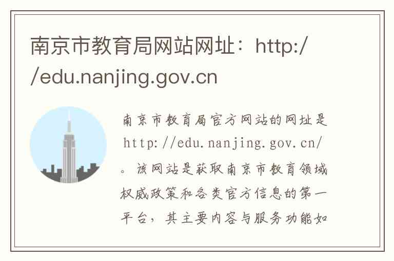 南京市教育局官方网站的网址是 http://edu.nanjing.gov.cn/ 。该网站是获取南京市教育领域权威政策和各类官方信息的第一平台,其主要内容与服务功能如下: