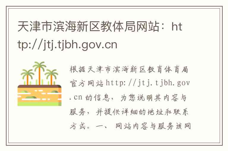 根据天津市滨海新区教育体育局官方网站 http://jtj.tjbh.gov.cn 的信息,为您说明其内容与服务,并提供详细的地址和联系方式。
