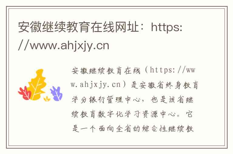 安徽继续教育在线(https://www.ahjxjy.cn)是安徽省终身教育学分银行管理中心,也是该省继续教育数字化学习资源中心。它是一个面向全省的综合性继续教育平台,主要为成Ren学历提升、职业培训及终身学习提供支持服务。