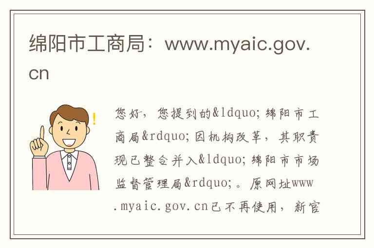 您好,您提到的“绵阳市工商局”因机构改革,其职责现已整合并入“绵阳市市场监督管理局”。原网址www.myaic.gov.cn已不再使用,新官网为scjg.my.gov.cn 。以下为您详细介绍其当前的内容、服务及联系方式。