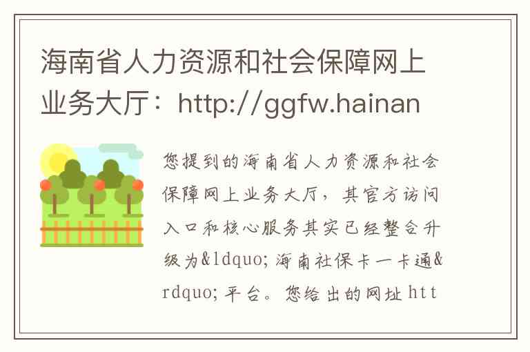 您提到的海南省人力资源和社会保障网上业务大厅,其官方访问入口和核心服务其实已经整合升级为“海南社保卡一卡通”平台。您给出的网址 http://ggfw.hainan.gov.cn 正是这一平台的官方地址。