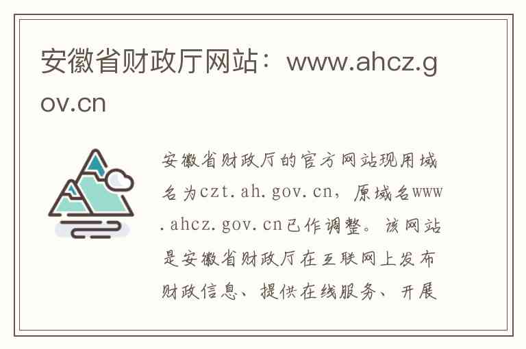 安徽省财政厅的官方网站现用域名为czt.ah.gov.cn,原域名www.ahcz.gov.cn已作调整。该网站是安徽省财政厅在互联网上发布财政信息、提供在线服务、开展互动交流的官方平台。以下是关于其内容、服务及联系方式的详细说明。