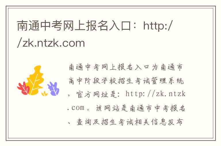 南通中考网上报名入口为南通市高中阶段学校招生考试管理系统,官方网址是:http://zk.ntzk.com 。该网站是南通市中考报名、查询及招生考试相关信息发布的官方平台,由南通市教育考试院主办 。