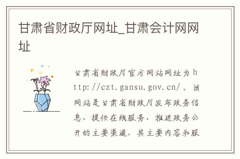 甘肃省财政厅官方网站网址为 http://czt.gansu.gov.cn/ 。该网站是甘肃省财政厅发布政务信息、提供在线服务、推进政务公开的主要渠道。其主要内容和服务涵盖多个方面,包括主动公开财政规章与规范性文件、全省财政收支情况、政府债务信息、政府采购实施情况以及公务员招考信息等 。网站还提供依申请公开服务,公民、法人或其他组织可通过该网站填写并提交政府信息公开申请表,申请获取未主动公开的政府信息 。此外,网站内设有多个导航栏目,如“新闻中心”、“政府信息公开”、“公众服务”、“政策法规”、“财政建设”、“甘肃会计”、“财会研究”等,方便用户查找各类财政资讯和办理相关业务 。其主办单位为甘肃省财政厅,网站备案号为陇ICP备15002215号-2,甘公网安备 62010002000481号 。