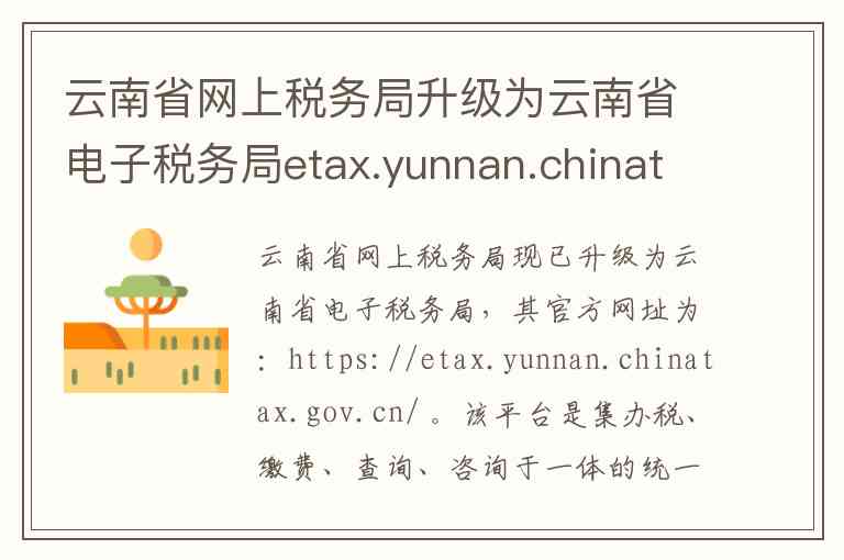 云南省网上税务局现已升级为云南省电子税务局,其官方网址为:https://etax.yunnan.chinatax.gov.cn/ 。该平台是集办税、缴费、查询、咨询于一体的统一智能化网上办税服务平台,旨在为纳税人提供“全天候、全覆盖、全流程”的便捷办税服务 。