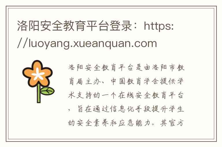 洛阳安全教育平台是由洛阳市教育局主办、中国教育学会提供学术支持的一个在线安全教育平台,旨在通过信息化手段提升学生的安全素养和应急能力。其官方网站登录地址正是您提供的 https://luoyang.xueanquan.com/ 。