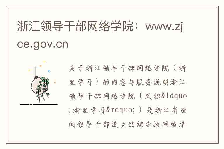 主域名:您可以通过浏览器访问浙江领导干部网络学院的官方网址:https://www.zjce.gov.cn 。