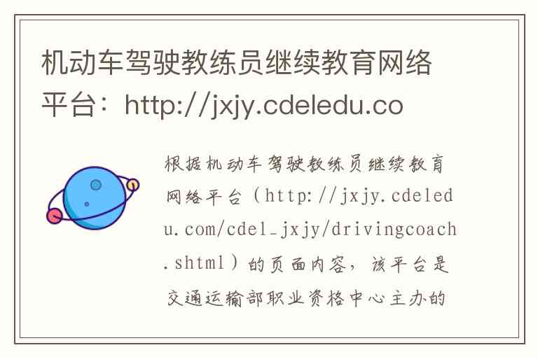 根据机动车驾驶教练员继续教育网络平台(http://jxjy.cdeledu.com/cdel_jxjy/drivingcoach.shtml)的页面内容,该平台是交通运输部职业资格中心主办的官方网络学习平台,主要为机动车驾驶教练员及相关从业人员提供继续教育服务。以下是对其内容、服务及相关信息的详细说明。