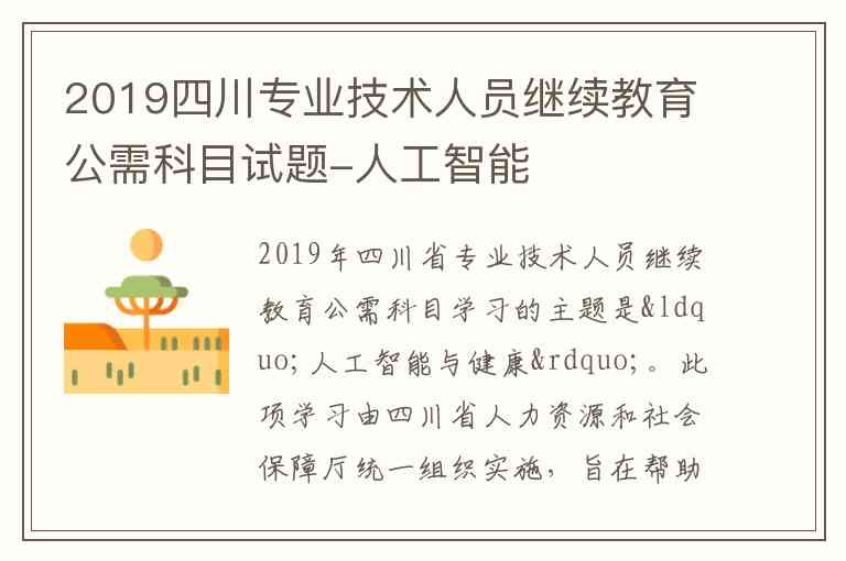 2019年四川省专业技术人员继续教育公需科目学习的主题是“人工智能与健康”。此项学习由四川省人力资源和社会保障厅统一组织实施,旨在帮助专业技术人员了解人工智能技术及其在健康领域的应用,优化知识结构。学习内容通常分为必修课和选修课,专业技术人员每年需完成累计30学时的公需科目学习,作为考核、聘任和晋职的依据之一。