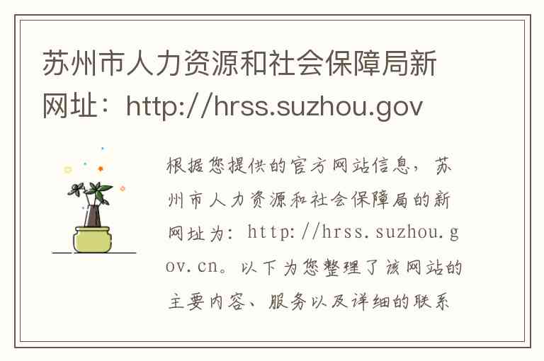 根据您提供的官方网站信息,苏州市人力资源和社会保障局的新网址为:http://hrss.suzhou.gov.cn。以下为您整理了该网站的主要内容、服务以及详细的联系方式和地址。