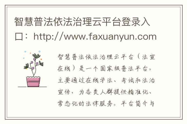 智慧普法依法治理云平台(法宣在线)是一个国家级普法平台,主要通过在线学法、考试和法治宣传,为各类人群提供精准化、常态化的法律服务。