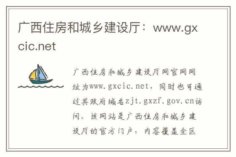 广西住房和城乡建设厅网官网网址为www.gxcic.net,同时也可通过其政府域名zjt.gxzf.gov.cn访问。该网站是广西住房和城乡建设厅的官方门户,内容覆盖全区建设系统各行业,集电子政务、业务管理、资源共享和信息服务于一体,旨在提供权威及时的政务与行业信息,推动建设行业信息化。
