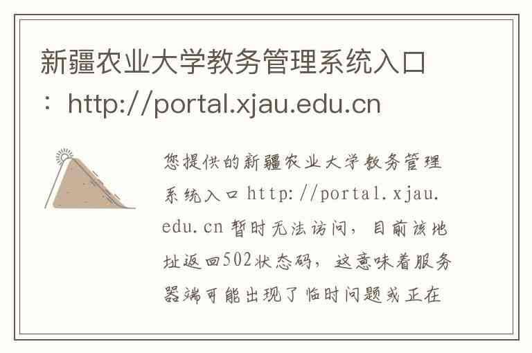 您提供的新疆农业大学教务管理系统入口 http://portal.xjau.edu.cn 暂时无法访问,目前该地址返回502状态码,这意味着服务器端可能出现了临时问题或正在维护,建议您稍后再试,或通过学校官网等其他路径尝试进入。