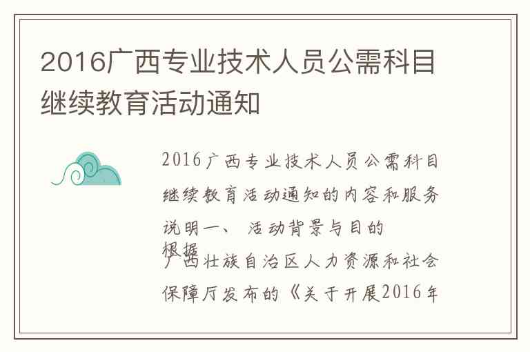 根据广西壮族自治区人力资源和社会保障厅发布的《关于开展2016年专业技术人员公需科目继续教育活动的通知》(桂人社函〔2016〕378号),为贯彻落实《专业技术人员继续教育规定》,深入实施我区专业技术人才知识更新工程,全面提高专业技术人员素质,自治区人力资源和社会保障厅于2016年继续开展专业技术人员公需科目继续教育活动 。