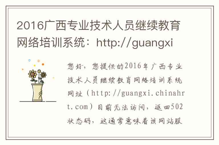 您好,您提供的2016年广西专业技术人员继续教育网络培训系统网址(http://guangxi.chinahrt.com)目前无法访问,返回502状态码,这通常意味着该网站服务器暂时无法提供正常服务或该地址已被停用。