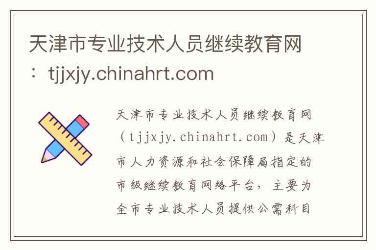 天津市专业技术人员继续教育网(tjjxjy.chinahrt.com)是天津市人力资源和社会保障局指定的市级继续教育网络平台,主要为全市专业技术人员提供公需科目的在线学习服务。以下是对其内容、服务、地址及联系方式的详细说明。