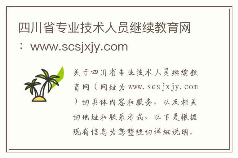 关于四川省专业技术人员继续教育网(网址为 www.scsjxjy.com)的具体内容和服务,以及相关的地址和联系方式,以下是根据现有信息为您整理的详细说明。