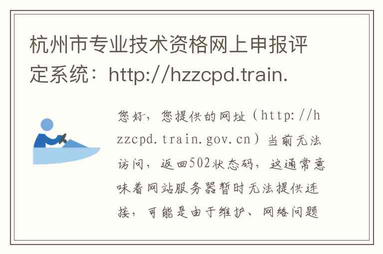 您好,您提供的网址(http://hzzcpd.train.gov.cn)当前无法访问,返回502状态码,这通常意味着网站服务器暂时无法提供连接,可能是由于维护、网络问题或系统升级导致。