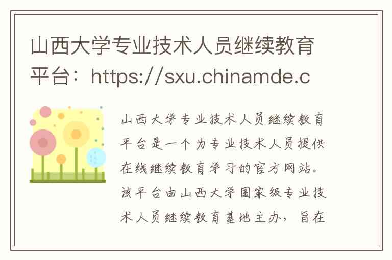 山西大学专业技术人员继续教育平台是一个为专业技术人员提供在线继续教育学习的官方网站。该平台由山西大学国家级专业技术人员继续教育基地主办,旨在帮助用户完成每年所需的继续教育学时,用于职称评定、岗位聘任等。以下为你详细说明其核心内容、服务、地址及联系方式。