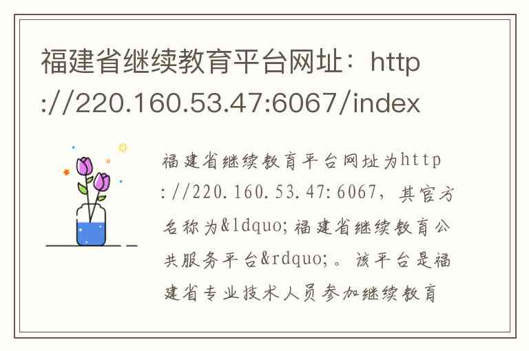 福建省继续教育平台网址为http://220.160.53.47:6067,其官方名称为“福建省继续教育公共服务平台”。该平台是福建省专业技术人员参加继续教育、进行学时登记与查询、打印官方证明的核心渠道。以下将对该平台的内容、服务及相关信息进行详细说明。