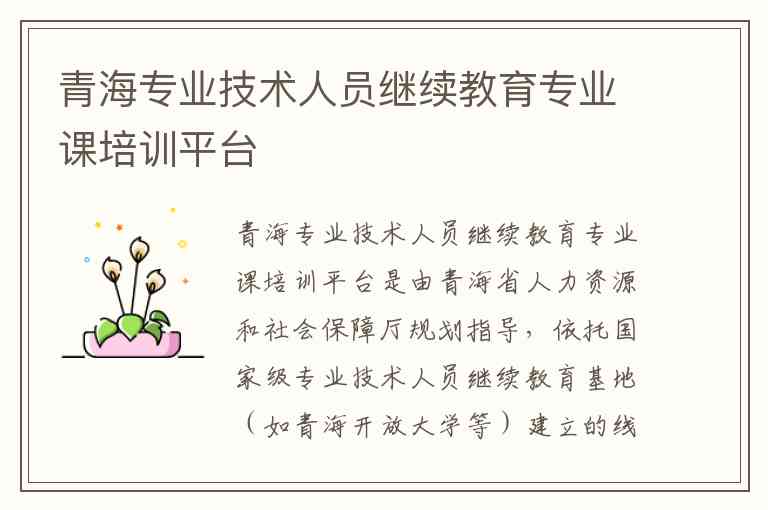 青海专业技术人员继续教育专业课培训平台是由青海省人力资源和社会保障厅规划指导,依托国家级专业技术人员继续教育基地(如青海开放大学等)建立的线上学习体系,旨在为全省专业技术人员提供知识更新、补充、拓展和提高专业知识及能力水平的教育服务。以下是关于该平台的内容、服务、地址及联系方式的详细说明: