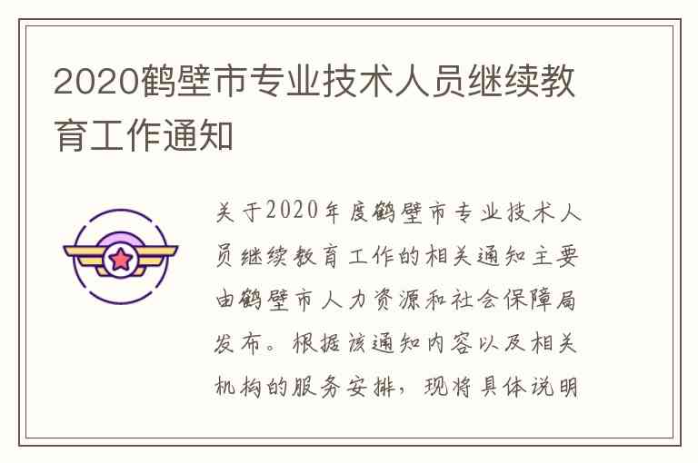 关于2020年度鹤壁市专业技术人员继续教育工作的相关通知主要由鹤壁市人力资源和社会保障局发布。根据该通知内容以及相关机构的服务安排,现将具体说明、服务内容以及联系方式整理如下。