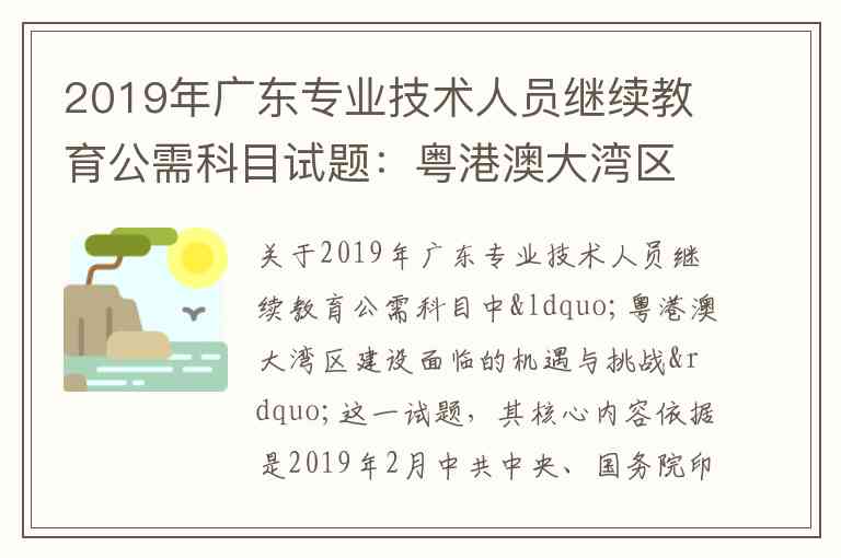 关于2019年广东专业技术人员继续教育公需科目中“粤港澳大湾区建设面临的机遇与挑战”这一试题,其核心内容依据是2019年2月中共中央、国务院印发的《粤港澳大湾区发展规划纲要》。以下是根据该纲要及相关官方信息整理的详细内容,包括机遇挑战的具体说明以及相关的服务举措与联系方式,均以纯文字形式呈现。