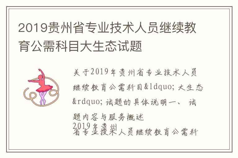 2019年贵州省专业技术人员继续教育公需科目的指定内容为“大生态相关知识学习”。该科目是根据贵州省“大生态”战略以及《贵州省生态文明建设促进条例》等相关文件精神设立的,旨在提升全省专业技术人员的生态文明建设理论水平和综合素质。