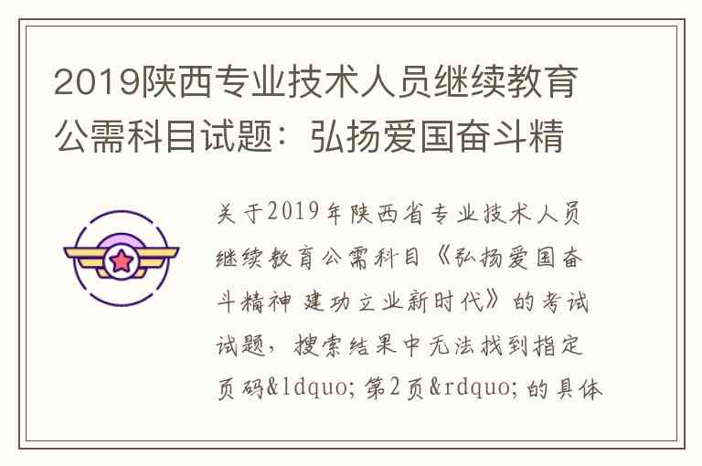 关于2019年陕西省专业技术人员继续教育公需科目《弘扬爱国奋斗精神 建功立业新时代》的考试试题,搜索结果中无法找到指定页码“第2页”的具体内容。不过,您可以参考以下为您整理的该科目考试的部分试题示例、培训服务信息及相关联系方式。