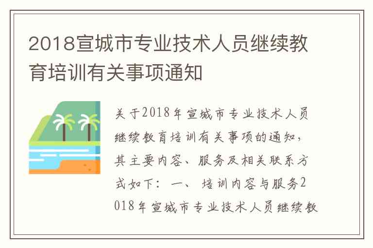 关于2018年宣城市专业技术人员继续教育培训有关事项的通知,其主要内容、服务及相关联系方式如下: