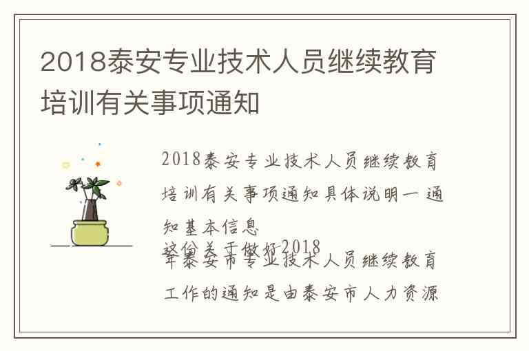 这份关于做好2018年泰安市专业技术人员继续教育工作的通知是由泰安市人力资源和社会保障局发布的发布日期为2018年4月19日该通知旨在进一步提高全市各类企事业单位在岗专业技术人员的综合素质根据专业技术人员继续教育规定山东省专业技术人员继续教育条例等相关要求组织开展年度培训工作