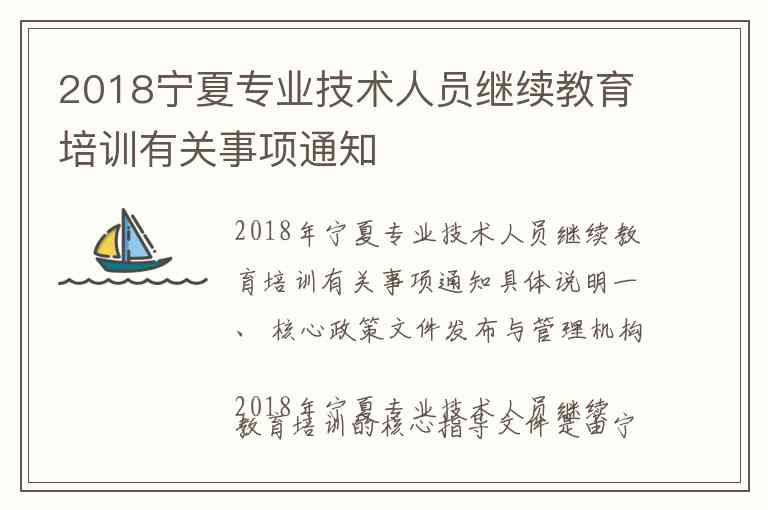 2018年宁夏专业技术人员继续教育培训的核心指导文件是由宁夏自治区人力资源和社会保障厅发布的《关于做好2018年全区专业技术人员继续教育工作的通知》(宁人社函〔2018〕205号)。该文件是全区专业技术人员参加继续教育、进行学时登记以及后续职称评审的重要依据。自治区人力资源社会保障厅负责整个继续教育工作的综合管理、监督和指导。